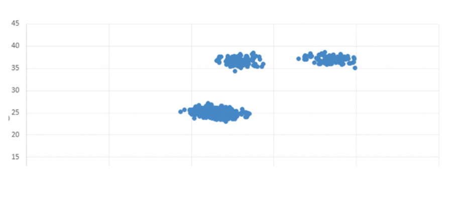 Для файла Б определите координаты центра каждого кластера, затем найдите два числа: \(B_1\) — число точек наименьшего по количеству точек кластера, находящихся внутри квадрата с центром в центре этого же кластера, сторонами параллельными координатным осям, и длиной 1,8, и \(B_2\) — расстояние по оси ординат между центрами кластеров со наибольшим и средним количеством точек.