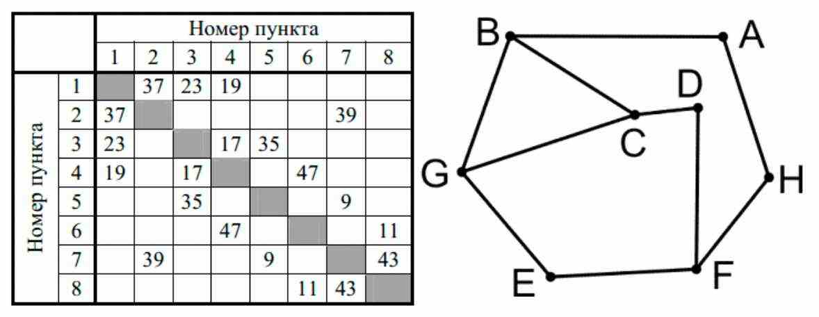 Так как таблицу и схему рисовали независимо друг от друга, нумерация населённых пунктов в таблице никак не связана с буквенными обозначениями на графе. Определите, какова сумма протяжённостей дорог из пункта В в пункт А и из пункта Н в пункт А.
