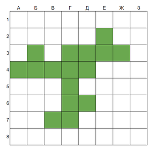 Влад раздобыл карту местности, разбил её на квадраты и закрасил на ней интересующий его участок. Получилась схема, изображённая на рисунке 2. Ему необходимо сделать фотографии всех закрашенных квадратов. Теперь он хочет написать программу для дрона, поставить дрона в какойнибудь закрашенной клетке и запустить его.