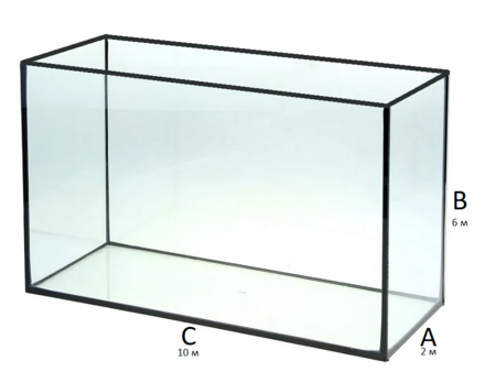 Напомним, что объем аквариума с размерами A м, B м и C м равен A· B · C м3. Например, объем аквариума на рисунке ниже равен 2 · 6 ·10 = 120 м3