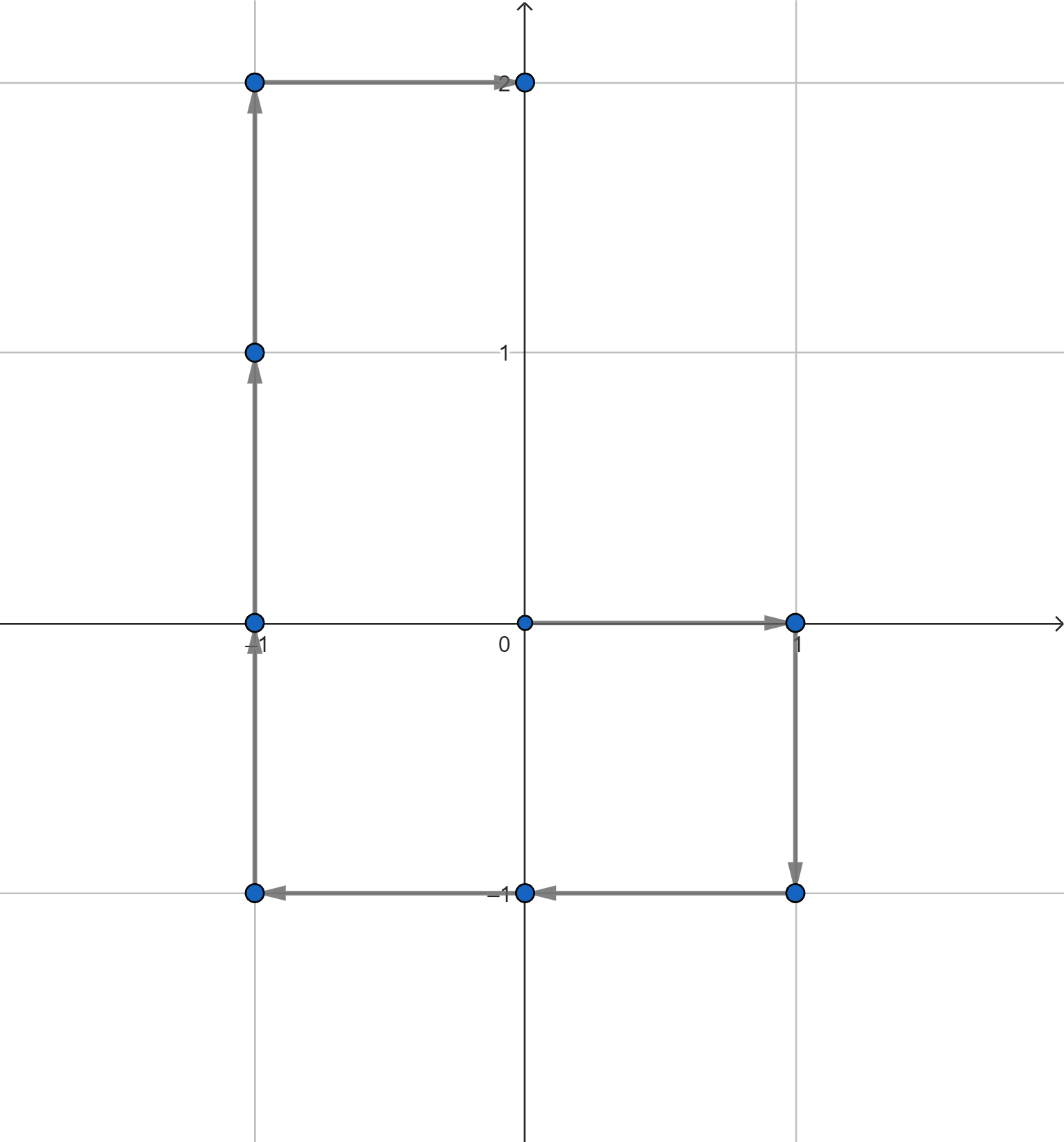 Аллен немного перебрал в баре, который находится в начале координат. Существуют \(n\) векторов \(\vec{v_1}, \vec{v_2}, \cdots, \vec{v_n}\). Аллен сделает \(n\) шагов. Так как Аллен дезориентирован, на \(i\)-м шаге он либо сделает шаг на вектор \(\vec{v_i}\), либо на вектор \(-\vec{v_i}\). Другими словами, если его позиция сейчас равна \(p = (x, y)\), то он окажется либо в \(p + \vec{v_i}\), либо в \(p - \vec{v_i}\).