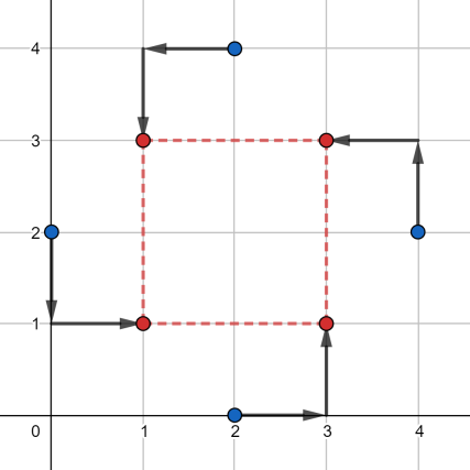 Коровы Фермера Джона стоят в различных точках (x1,y1)…(xn,yn) его поля (1≤N≤100,000, все xi и yi - положительные нечётные целые числа, не превышающие 1,000,000. ФД хочет разделить своё поле изгородью бесконечной длины с севера на юг, описываемой уравнением x=a (a - чётное целое, так обеспечивается, что изгородь не пройдёт через позицию ни одной коровы). Также он хочет построить изгородь бесконечной длины с востока на запад, которая описывается уравнением y=b, где b - чётное целое. Эти две изгороди пересекаются в точке (a,b), и вместе делят поле на четыре региона.