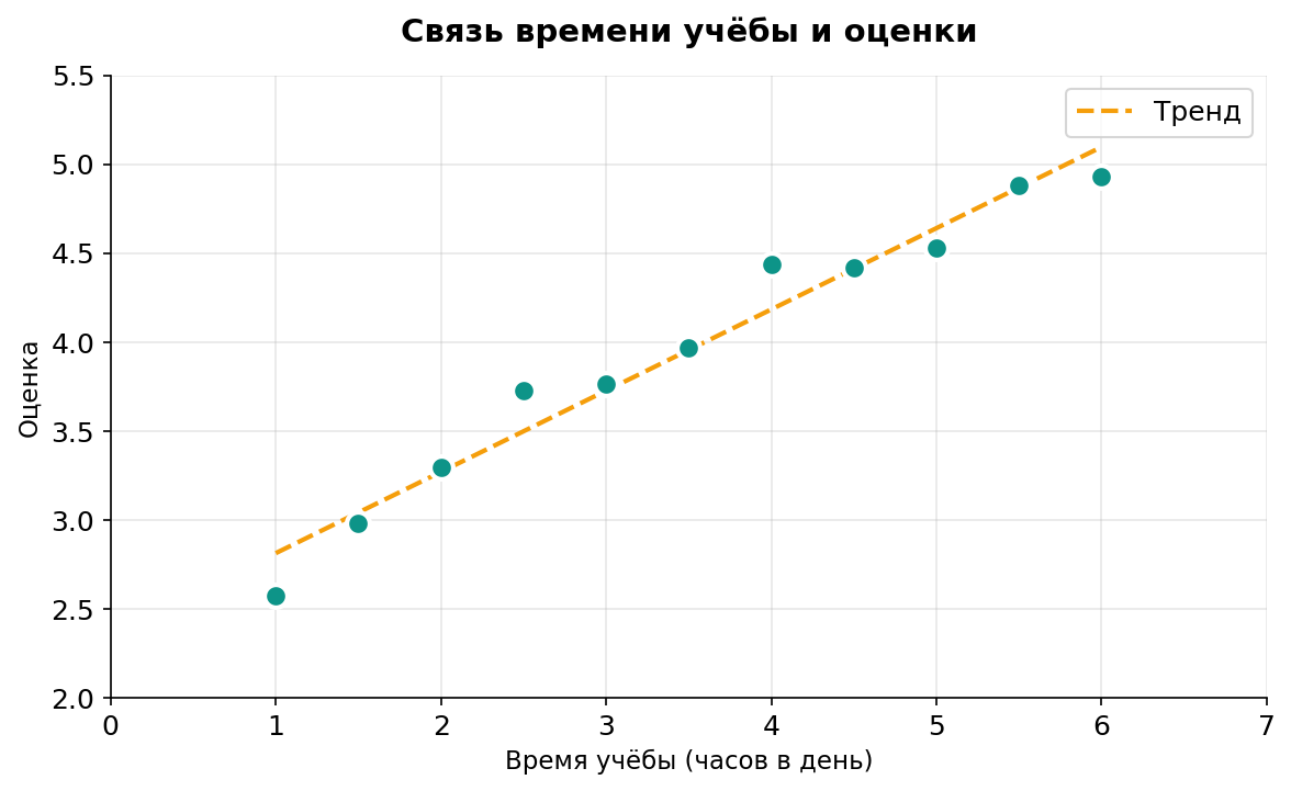 💡 Совет: Добавь линию тренда (оранжевая на примере), чтобы показать направление зависимости.
