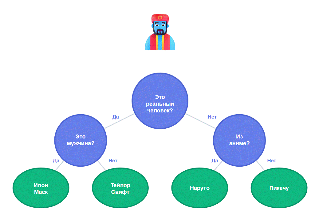Каждый узел — это вопрос, каждый лист — финальный ответ.
