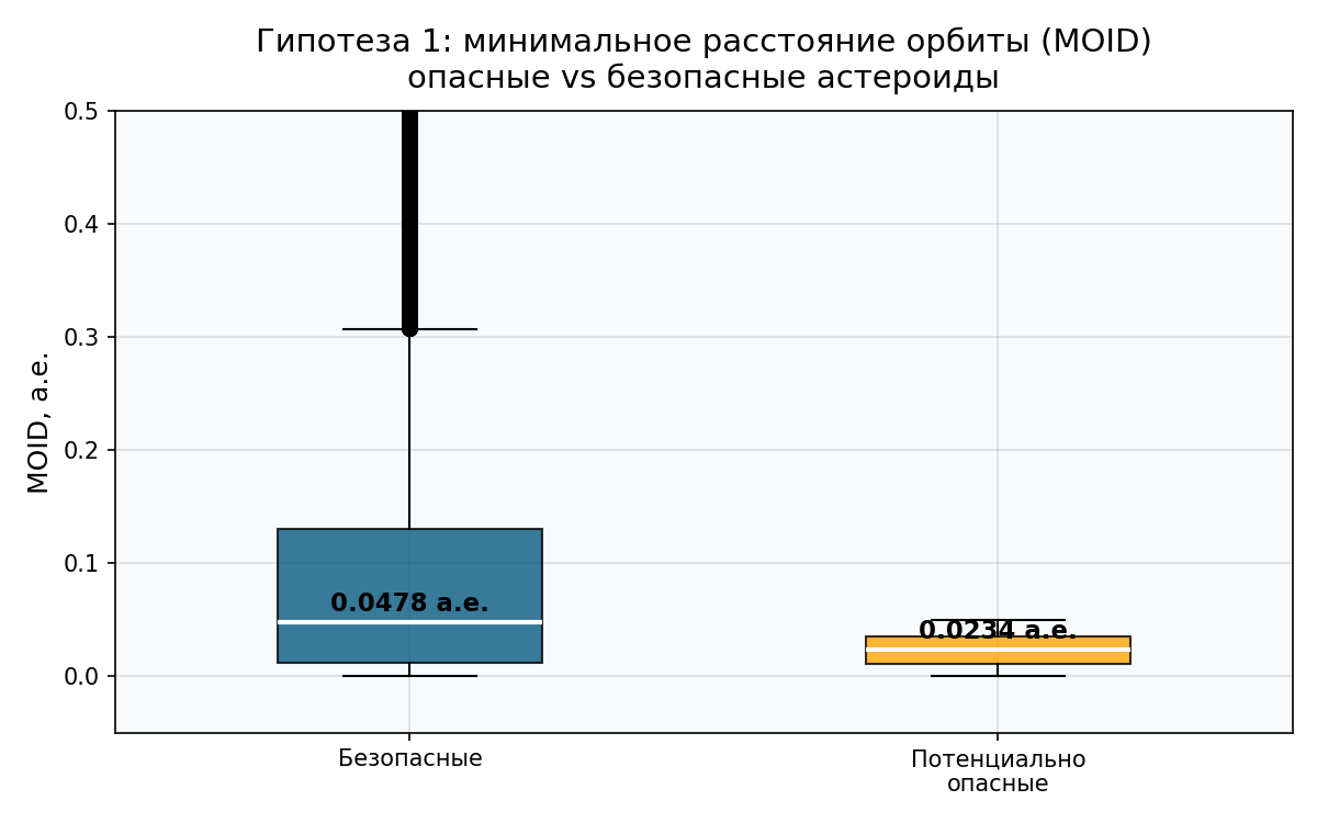 На графике отчётливо видно: ящик «потенциально опасных» расположен значительно ниже. Медиана у опасных — 0,023 а.е., у безопасных — 0,048 а.е., то есть разница в 2 раза.