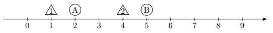 В случае же, показанном на следующем рисунке, есть лишь один способ соединить гнезда: 1 с A, а 2 с B. Гнездо 2 нельзя соединить с A, поскольку A расположено левее. Так что в этом случае необходимо 2 метра кабеля.