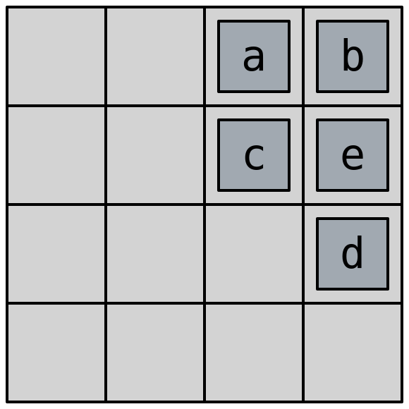 Назовем расположение фишек лестницей, если \(m=n\), \(a_{ij}={<<\texttt{.}>>}\) для всех \(1 \le i \le j \le n\) и \(a_{ij}\ne{<<\texttt{.}>>}\) для всех \(1 \le j < i \le n\). Иными словами, все фишки находятся на клетках ниже главной диагонали доски, и на каждой клетке ниже главной диагонали есть фишка.