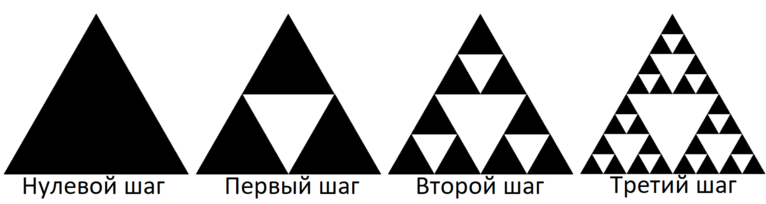 Сначала рисуем черный равносторонний треугольник. Затем ставим точку на середине каждой из его сторон. Поставленные точки соединяем отрезками и получаем четыре треугольника внутри исходного это первый шаг алгоритма. Центральным треугольником называется тот, который находится в центре. Центральный треугольник вырезают ножницами и выбрасывают. На рисунке образовавшееся пустое место закрашено белым цветом. Далее повторяем первый шаг для каждого из трех оставшихся черных треугольников и получаем 9 черных треугольников внутри исходного. Для них описанный шаг алгоритма повторяем снова и снова. На рисунке белым цветом обозначены вырезанные после каждого шага треугольники.