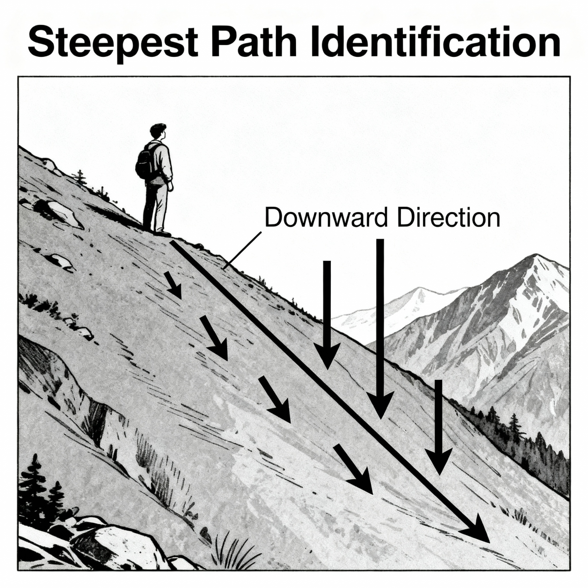Представьте: вы стоите на склоне горы в густом тумане и хотите спуститься вниз. Вы не видите всю гору целиком, только то, что под ногами.