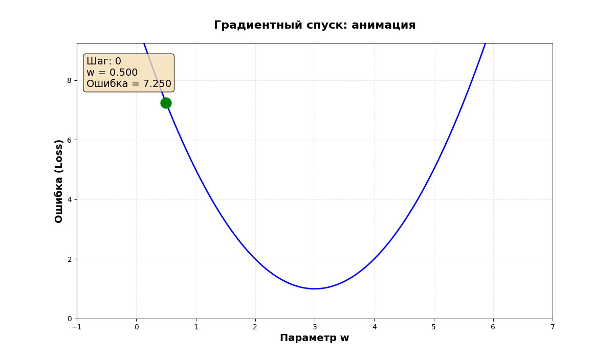 - \( \frac{\partial \text{Loss}}{\partial w} \) — градиент по w. Показывает, как сильно меняется ошибка при изменении \( w \)