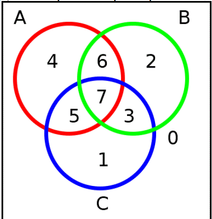 На изображении выделены восемь непересекающихся пронумерованных областей (область, пронумерованная нулем, означает точки, не принадлежащие ни одной из окружностей).