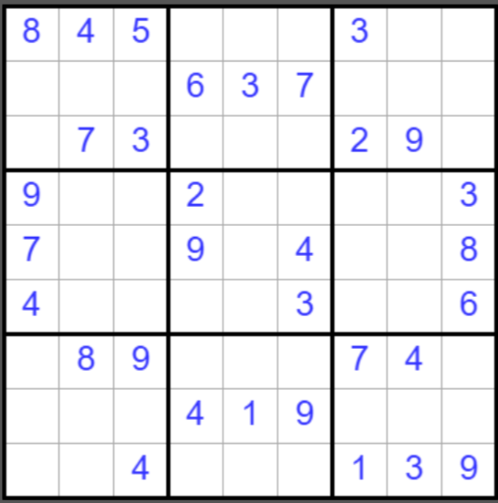 Задача - вписать в пустые ячейки головоломки числа от 1 до 9 так, чтобы в каждом горизонтальном ряду, в каждой вертикальной колонке и в каждом блоке каждое число встречалось только однажды.