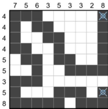 Задача — соединить “голову” и “хвост” одной непрерывной линией, закрасив нужные клетки чёрным. При этом “змея” не должна касаться сама себя, в том числе и клетками, расположенными по диагонали. Числа слева и сверху от сетки означают, сколько черных клеток содержится в соответствующих строках и столбцах.