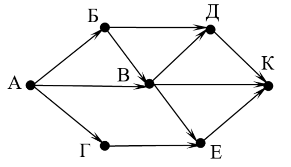 На рисунке – схема дорог, связывающих города А, Б, В, Г, Д, Е и К. По каждой дороге можно двигаться только в одном направлении, указанном стрелкой. Сколько существует различных путей из города А в город К?