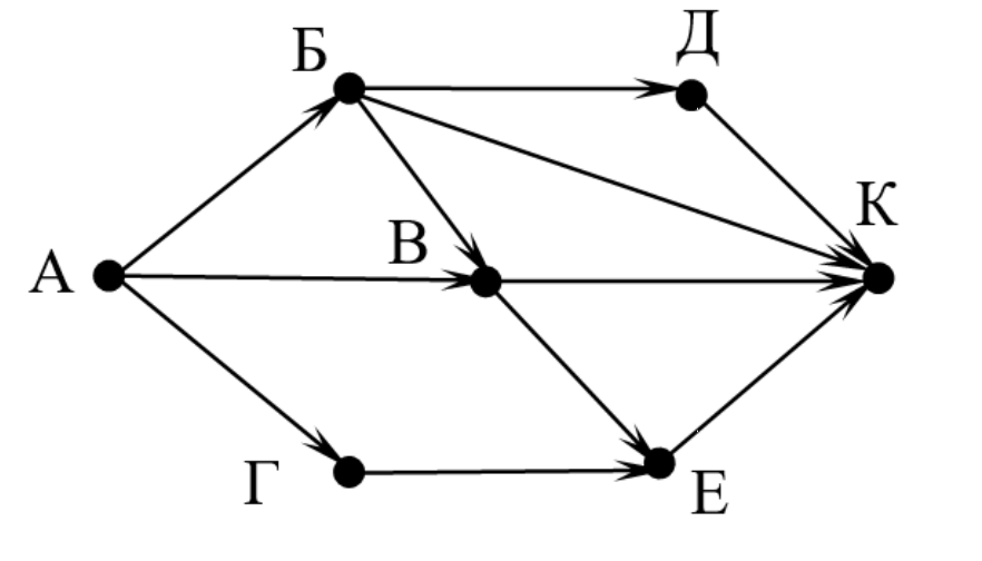 На рисунке – схема дорог, связывающих города А, Б, В, Г, Д, Е и К. По каждой дороге можно двигаться только в одном направлении, указанном стрелкой. Сколько существует различных путей из города А в город К?