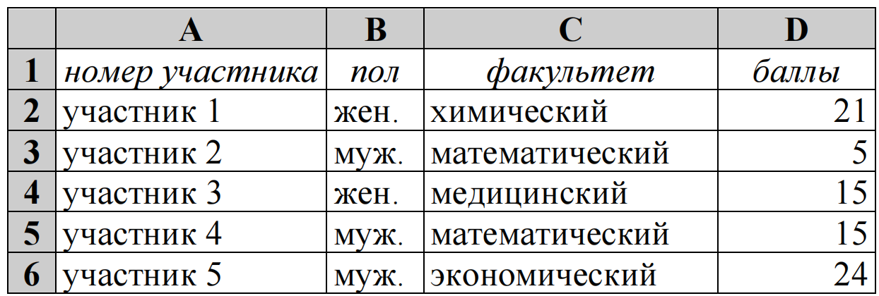 В столбце A указан номер участника; в столбце B – пол; в столбце C – один из четырёх факультетов: математический, медицинский, химический, экономический; в столбце D – количество набранных баллов (от 5 до 25). Всего в электронную таблицу были занесены данные по 1000 участникам. Порядок записей в таблице произвольный.
