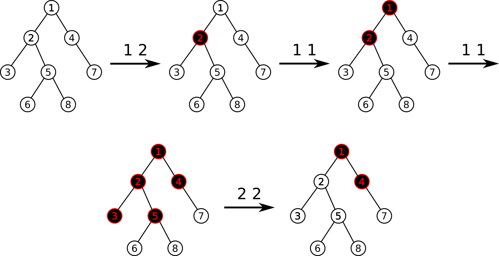 - Если вершина \(v\) белая, перекрасить её в чёрный цвет; в другом случае вместо этого выполнить эту операцию со всеми непосредственными сыновьями \(v\).