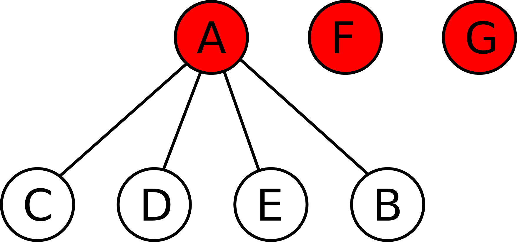 Например, может произойти следующее. Пусть \(A\) и \(B\) — активные стартапы, \(C\), \(D\), \(E\) — приобретенные с владельцем \(A\), а \(F\), \(G\) — приобретенные с владельцем \(B\):