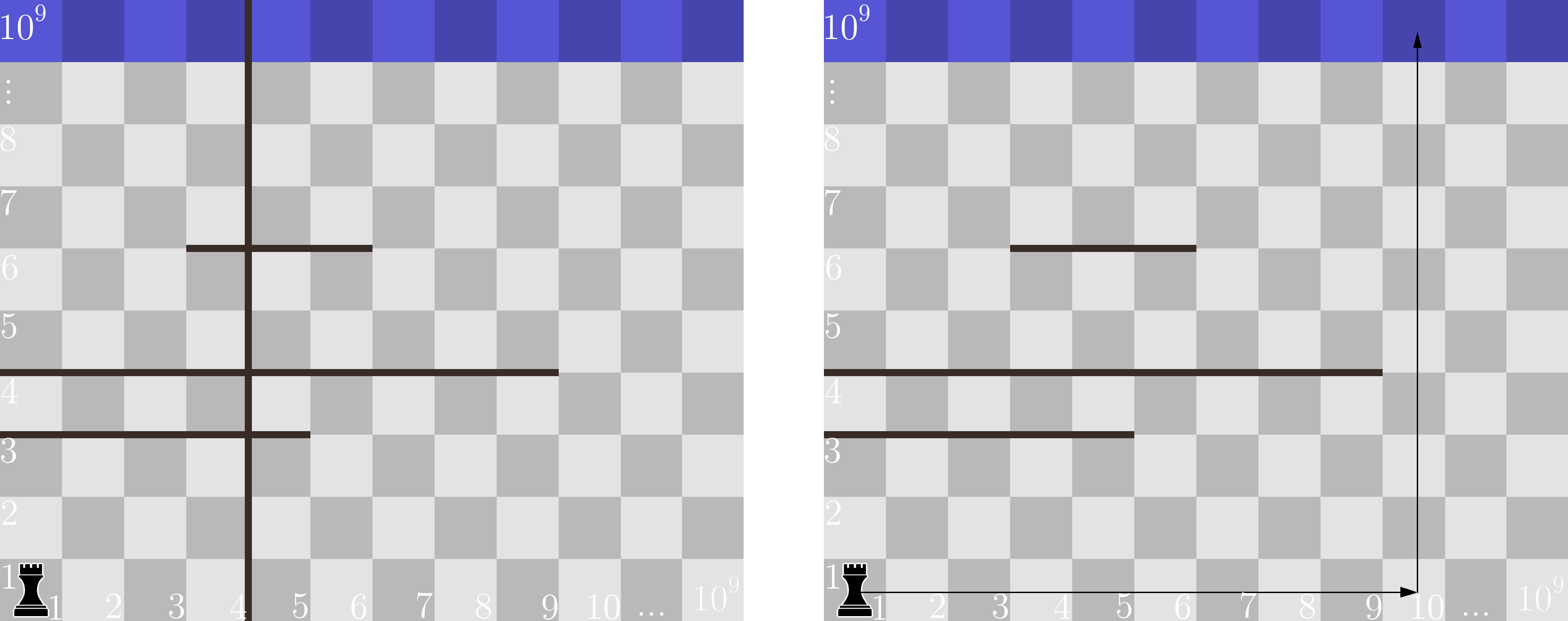 На этой доске каждый день проходят бои между чёрными и белыми фигурами. Сегодня победу одержали чёрные, но какой ценой? В живых осталась лишь ладья, и то, загнанная в левый нижний угол — клетку с координатами \((1,1)\). Но она все равно счастлива, ведь победа одержана и надо её отпраздновать! Для того чтобы это сделать, ладье нужно вернуться домой, а именно — на верхнюю сторону поля (то есть в любую клетку, которая находится в строке под номером \(10^9\)).