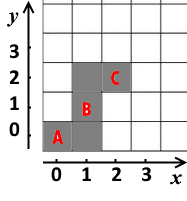 Например, \(A=(0,0)\), \(B=(1,1)\), \(C=(2,2)\). Необходимо очистить как минимум \(5\) участков, чтобы соединить друзей. Эти участки выделены серым цветом. Конечно, друзья не хотят слишком напрягаться. Помогите им найти наименьшее количество участков, которые они должны очистить от деревьев.