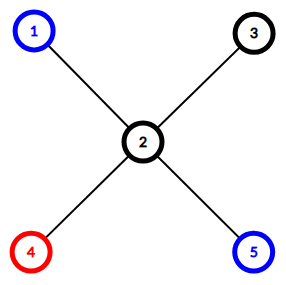 Единственный хороший набор — это ребро \((2, 4)\). После его удаления дерево распадается на компоненты \(\{4\}\) и \(\{1, 2, 3, 5\}\). В первой компоненте есть только вершина цвета \(1\), а во второй — только вершины цвета \(2\) и непокрашенные вершины.