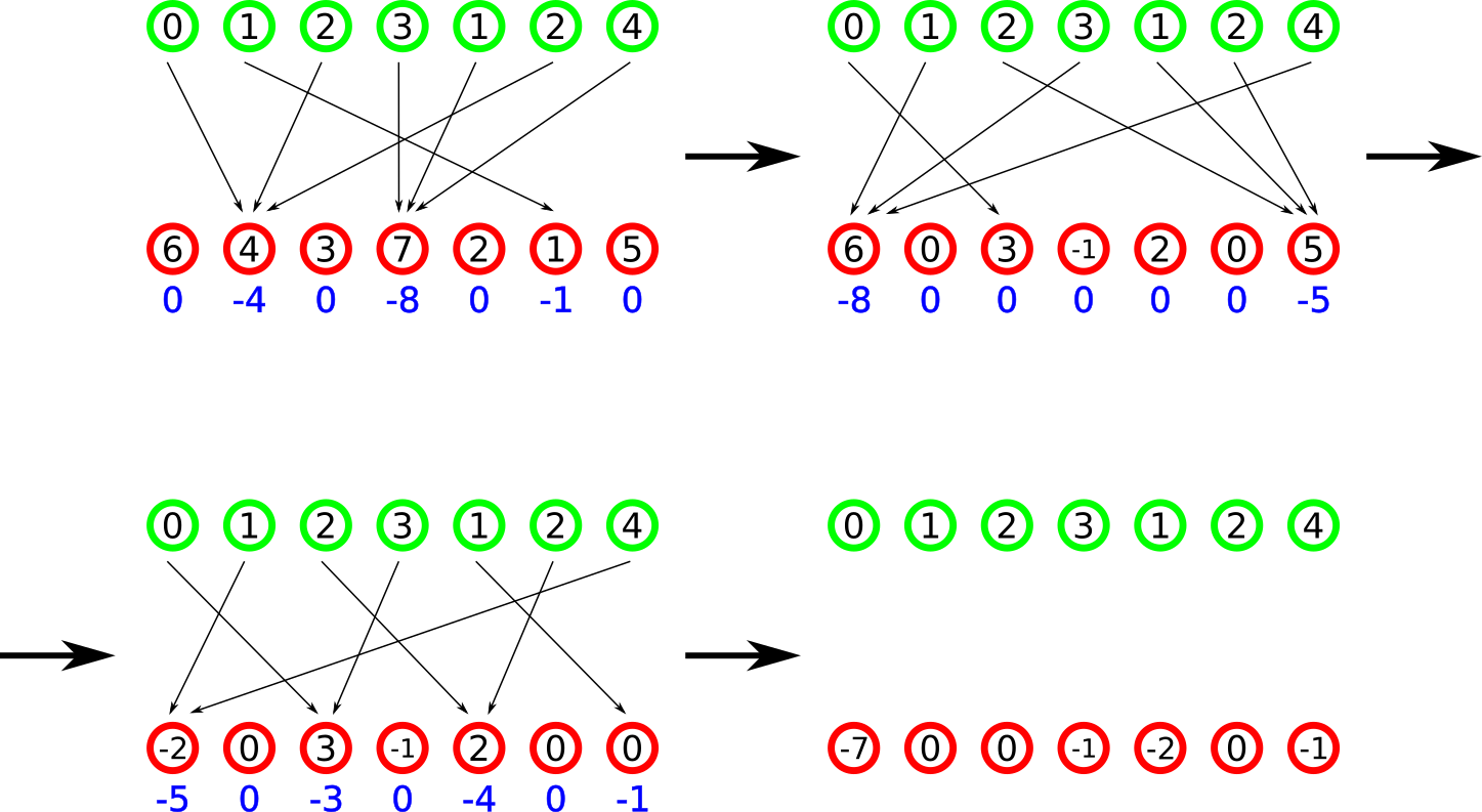 Пример шага битвы. Числа в зеленых кружках показывают число солдат в группах армии Евлампия, стрелки показывают атаки, числа в красных кружках показывают запас здоровья групп противника, синие числа показывают, насколько после этого шага уменьшится запас здоровья каждой из групп. Евлампий понял, что предстоящее сражение отнимет у него всю ночь. Это очень его расстроило, ведь тогда он не успеет сделать домашнее задание. Теперь Евлампий просит вас написать программу, которая поможет ему победить в сражении за наименьшее число ходов и показать, как это сделать. Сможете ли вы ему помочь?