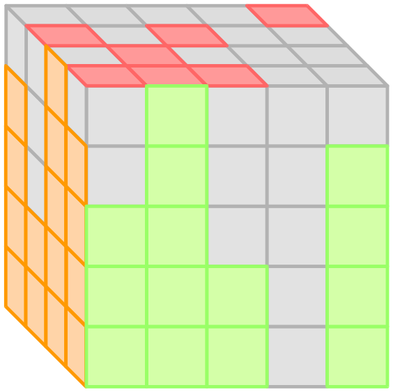 Сервал не расскажет вам \(h_{i,j}\), он даст вам только вид спереди, вид слева, и вид сверху этой фигуры, и попросит вас восстановить фигуру. Вид спереди описывается \(m\) столбцами, и высота \(i\)-го из них равна максимуму среди \(h_{1,i},h_{2,i},\dots,h_{n,i}\). Аналогично описывается и вид слева, он задан \(n\) столбцами. Вид сверху описывается матрицей \(n \times m\) \(t_{i,j}\), где \(t_{i,j}\) равно \(0\) или \(1\). \(t_{i,j}\), равное \(1\), означает, что \(h_{i,j}>0\), иначе \(h_{i,j}=0\).