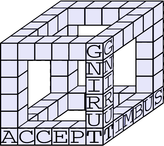 Наконец, вы пишете по одной букве в каждый единичный кубик. Вдоль каждого ребра большого куба должно получиться осмысленное слово. Буквы на любом ребре могут быть прочитаны в любом направлении, и достаточно, чтобы хотя бы в одном из направлений получилось осмысленное слово.