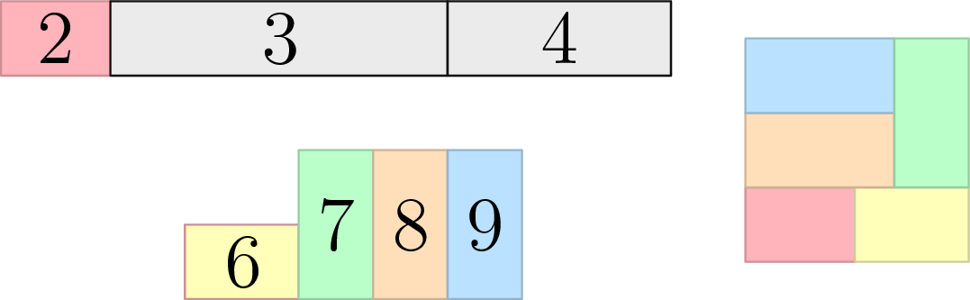 Затем мы берем прямоугольник, который у нас все еще лежит с первого шага, и четыре меньших прямоугольника, и собираем из них желаемый квадрат три на три.