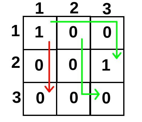 \(i\)-я из \(n\) последующих строчек должна содержать строку длины \(n\) соответствующую \(i\)-й строке поля. Верхний левый элемент должен равняться \(1\), нижний правый \(0\).
