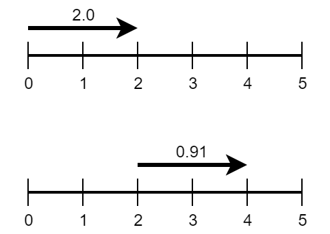 Картинка изображает первые два примера. В первом примере есть траволатор из \(0\) в \(2\) скорости \(2.0\), а Лимак хочет попасть в точку \(5\). Во втором примере есть траволатор из \(2\) в \(4\) скорости \(0.91\).