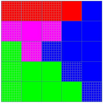 - Набор клеток, отданных одной курице, должен образовать связную область. Другими словами, если две клетки \((x, y)\) и \((u, v)\) отданы одной и той же курице, эта курица может пройти от \((x, y)\) до \((u, v)\), проходя только свои клетки и перемещаясь из каждой клетки в другую, разделяющую одну сторону (то есть, связность «по стороне»).