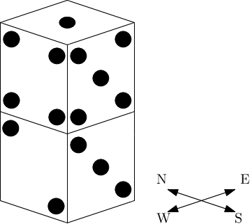 Например, количество видимых точек на башне, нарисованной ниже, равно \(29\) — число точек на верхней грани верхнего кубика равно \(1\), а с четырех сторон башни видны грани со следующим количеством точек: \(5\) и \(3\) с южной стороны, \(4\) и \(2\) с западной стороны, \(2\) и \(4\) с северной стороны, и \(3\) и \(5\) с восточной стороны.