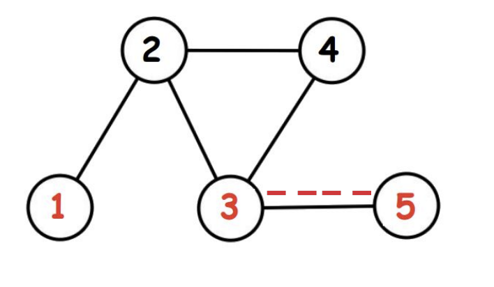 Граф из первого примера изображен ниже. Особые поля отмечены красным. Для Фермера Джона оптимально построить дорогу между полями \(3\) и \(5\), тогда кратчайший путь из \(1\) в \(5\) будет равен \(3\).