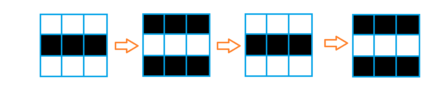 На каждой итерации этой игры (исходная итерация это \(0\)) цвет клетки будет изменяться по следующим правилам: