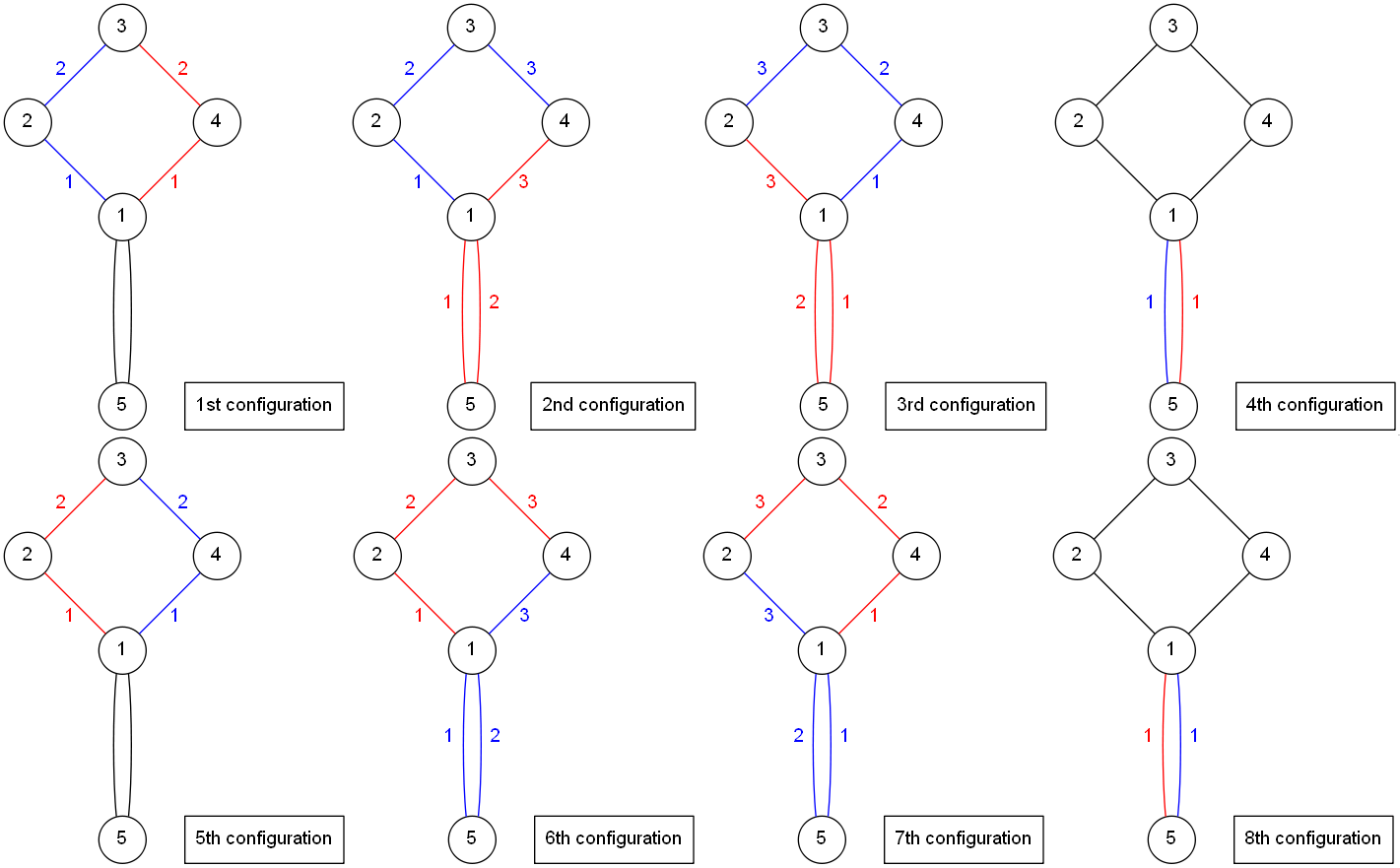 - Each phase, from their current checkpoint, \(Blue\) and \(Red\) select a different gray route and moves to the checkpoint on the other end of the route simultaneously.