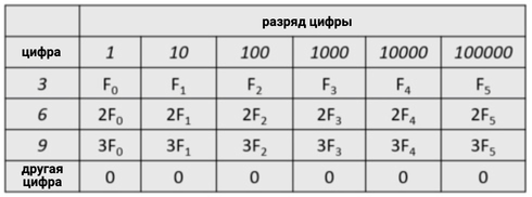 Как ни странно, у овечек есть свои суеверия насчет цифр, и они верят, что цифры \(3\), \(6\) и \(9\) счастливые. Для них удача числа зависит от его десятичного представления; удача всего числа является суммой удачи каждой из его цифр, а удача каждой цифры зависит от величины и позиции согласно следующей таблице. Например, удача числа \(319\) равна \(F_{2} + 3F_{0}\).