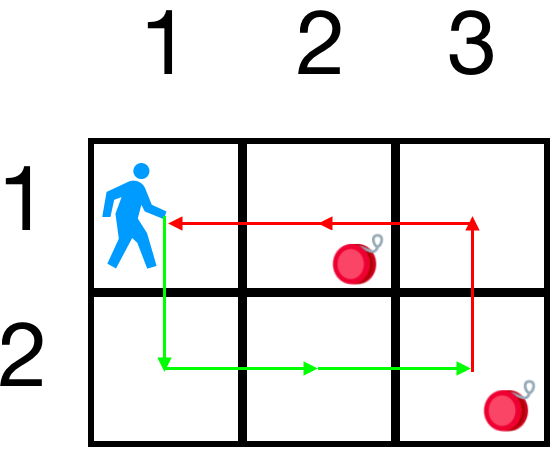 Поскольку Антону не нравятся йо-йо, брошенные на пол, он должен поднять оба йо-йо и вернуться в исходную клетку. Расстояние, пройденное Антоном — это кратчайший путь, который проходит через позиции обоих йо-йо и возвращается в \((i, j)\), если можно проходить только в соседние по стороне клетки. То есть, если он находится в клетке \((x, y)\), то за один шаг (если клетка с такими координатами существует) он может попасть в одну из клеток \((x + 1, y)\), \((x - 1, y)\), \((x, y + 1)\) и \((x, y - 1)\).
