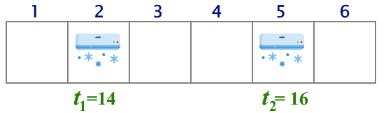 Рассмотрим пример. Пусть \(n=6, k=2\), первый кондиционер стоит в клетке \(a_1=2\) включен на температуру \(t_1=14\), а второй стоит в клетке \(a_2=5\) и включен на температуру \(t_2=16\). В таком случае температуры воздуха в клетках будут следующими: