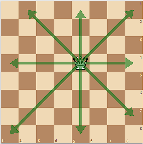 За один ход вы можете переместить ферзя на любую клетку на той же горизонтали, вертикали или любой из двух диагоналей. Например, если ферзь был в клетке (\(4\), \(5\)), вы можете переместиться на (\(q_1\), \(5\)), (\(4\), \(q_1\)), (\(q_1\), \(9-q_1\)) или (\(q_2\), \(q_2+1\)), где (\(1 \le q_1 \le 8\), \(q_1 \ne 4\), \(1 \le q_2 \le 7\), \(q_2 \ne 4\)). Заметьте, что ферзь не может оставаться на месте.