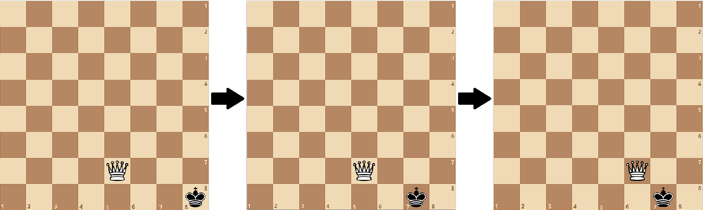 За один ход король может переместиться «Вправо», «Влево», «Вверх», «Вниз», «Вниз-Вправо», «Вниз-Влево», «Вверх-Влево», или «Вверх-Вправо» так, чтобы оставаться на доске. Король не может ходить в клетку, находящуюся на одной горизонтали, вертикали или диагонали с ферзем (включая клетку, где стоит ферзь). Например, если король был на клетке (\(4\), \(5\)), он может сходить в (\(4+k_1\), \(5+k_2\)) где (\(-1 \le k_1,k_2 \le 1\), \((k_1, k_2) \ne (0, 0)\)).