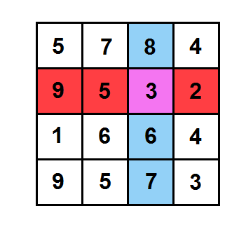 Например, пусть игра завершилась таким образом. Тогда фиолетовая клетка выигрышная, потому что сумма чисел в ее вертикали равна 8 + 3 + 6 + 7 = 24, а сумма чисел в ее горизонтали равна 9 + 5 + 3 + 2 = 19, и 24 > 19.