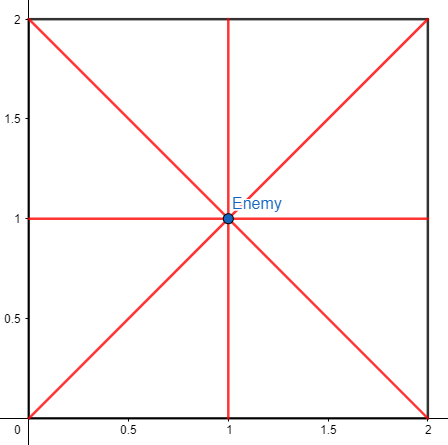- усиленные противника стреляют лазеров в восемь направлений: четыре направления совпадают с базовой версией, а еще четыре — в направление векторов \((1, 1)\), \((1, -1)\), \((-1, 1)\), \((-1, -1)\).
