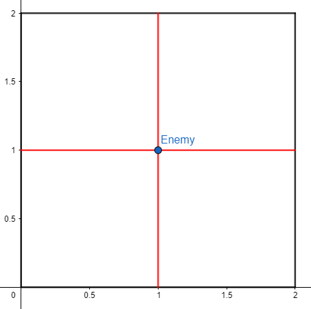 - базовые противники стреляют лазером в четыре направления: вправо (в направлении вектора \((1, 0)\)), влево (в направлении вектора \((-1, 0)\)), вверх (в направлении вектора \((0, 1)\)) и вниз (в направлении вектора \((0, -1)\));