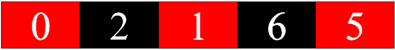 Пример покраски числа для \(A = 3\) и \(B = 13\) На рисунке выше показан пример покраски числа \(x = 02165\) из \(n = 5\) цифр для \(A = 3\) и \(B = 13\). Красные цифры образуют число \(015\), которое делится на \(3\), а чёрные — \(26\), которое делится на \(13\). Заметим, что абсолютная величина разности количеств красных и чёрных цифр равна \(1\), меньшего значения добиться невозможно.