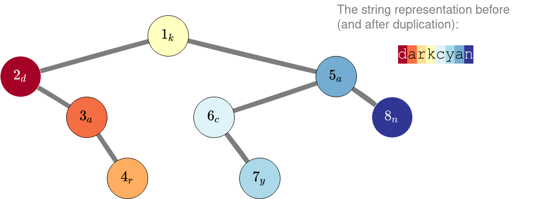 Рисунке ниже иллюстрируют примеры. Число в вершине обозначает номер вершины, а строка в нижнем индексе — строку, написанную в вершине. Справа находится строковое представление дерева, где каждая буква имеет цвет соответствующей вершине дерева.