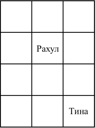 Следовательно, расстояние между Тиной и Рахулом равно \(|3-1| + |1-3| = 4\). Мы можем доказать, что это действительно минимально возможное расстояние при заданных ограничениях. Могут быть и другие варианты мест, которые также приводят к тому же ответу.