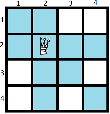Полуферзь может атаковать клетки, стоящие в той же строке, том же столбце и на той же диагонали, что и он. Более формально, полуферзь, стоящий в \((a, b)\) может атаковать клетку \((c, d)\), если \(a=c\), или \(b=d\), или \(a-b=c-d\).