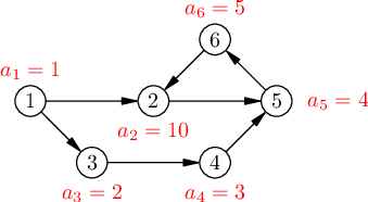 У Маши есть ориентированный граф, в \(i\)-й вершине которого записано некоторое целое положительное число \(a_i\). Изначально Маша может положить в некоторую вершину графа монетку. За один ход разрешается переместить монетку, которая сейчас находится в некоторой вершине \(u\), в любую вершину \(v\), такую что в графе существует ориентированное ребро \(u \to v\). Каждый раз, когда монетка оказывается в какой-либо вершине \(i\), Маша записывает в блокнот число \(a_i\) (в частности, когда Маша изначально кладет монетку в некоторую вершину графа, она пишет в блокнот число, записанное в этой вершине). Маша хочет сделать ровно \(k - 1\) ходов таким образом, чтобы максимальное число, записанное ей в блокноте, было как можно меньше.