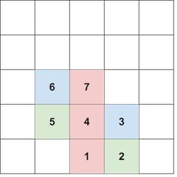 - Для \(2 \le i \le n\) обозначим за \((x, y)\) клетку, в которой вы разместили \((i - 1)\)-й блок. Вы можете разместить \(i\)-й блок в одну из свободных клеток \((x + 1, y)\), \((x - 1, y)\), \((x, y + 1)\) (но не в клетку \((x, y - 1)\)). Обратите внимание, что вы не можете размещать блок в клетке, уже содержащей блок.